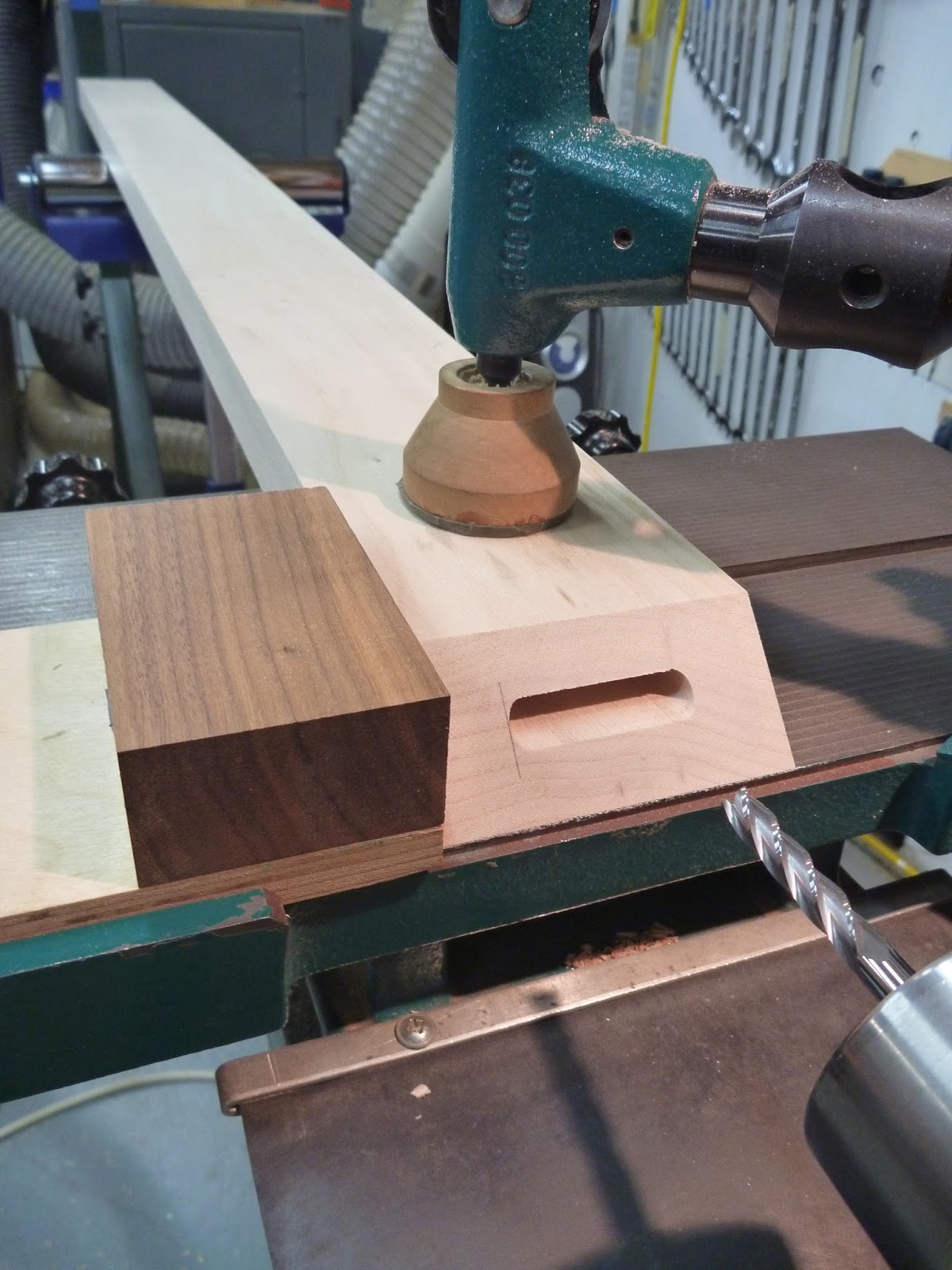 Cutting a series of stopped sliding dovetails for these ribs that run across the cabinet. One of my usual plywood offcut, double stick tape, router template guide type jig:
